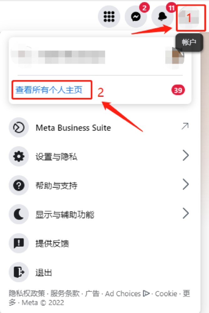 1、在Facebook首頁,使用有公共主頁管理員權(quán)限的賬號(hào),按圖示操作,打開“查看所有個(gè)人主頁”
