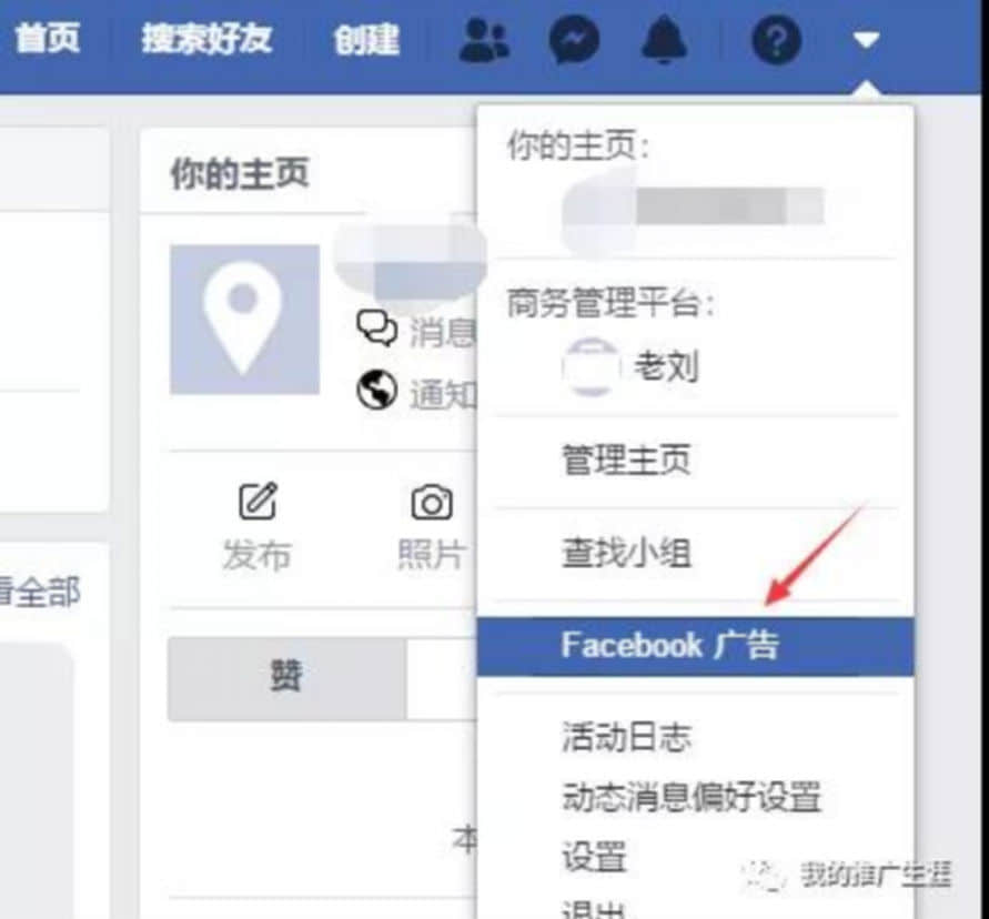 這個(gè)相對(duì)而言就會(huì)簡(jiǎn)單很多,直接登入你的facebook賬號(hào),點(diǎn)擊右上角的箭頭,可以看到“Facebook廣告”,點(diǎn)擊進(jìn)入,就可以直接投放廣告了。