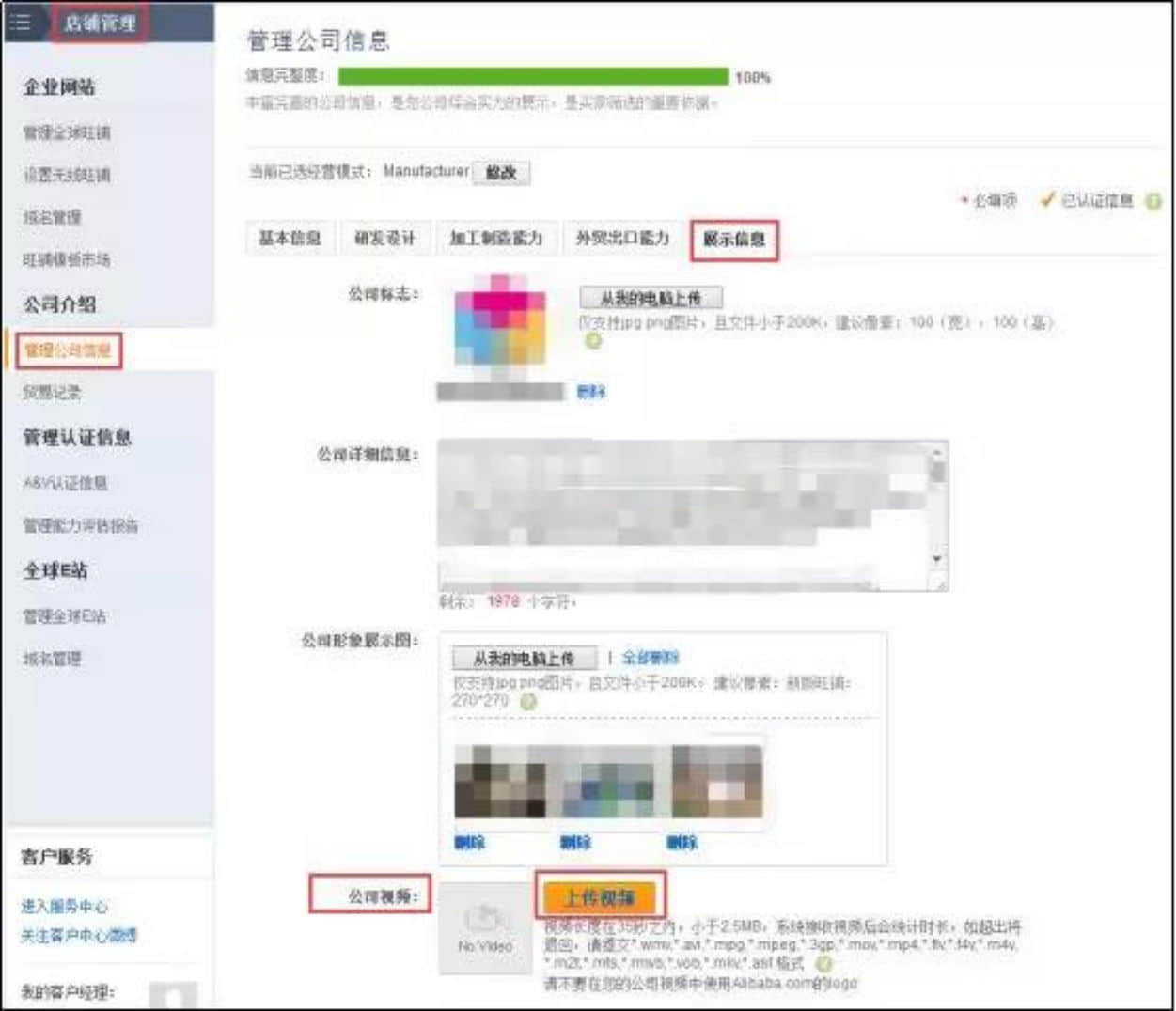 1. 主賬號(hào)登錄 My Alibaba—店鋪管理—管理公司信息—展示信息—公司視頻。