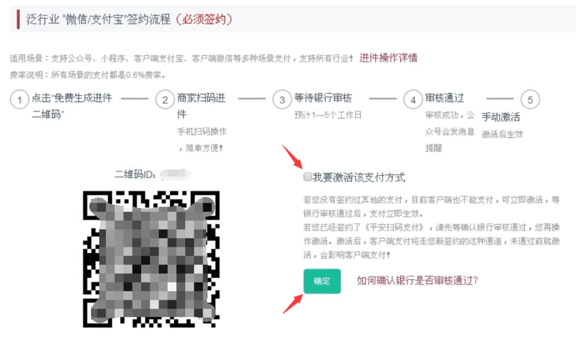 3、微信掃描生成的【進件二維碼】,提交商戶資料進行申請;審核通過后,勾選【我要激活該支付方式】,然后,點擊確定即可!